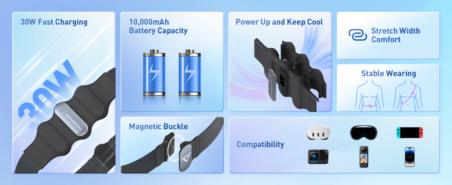 Dual-Worn Design Revolution: Carina W1’s innovative design allows wearing as a waist belt or cross-body strap. Made with food-safe TPU and adjustable elastic, it offers comfort and a secure fit, redistributing weight for enhanced VR immersion.